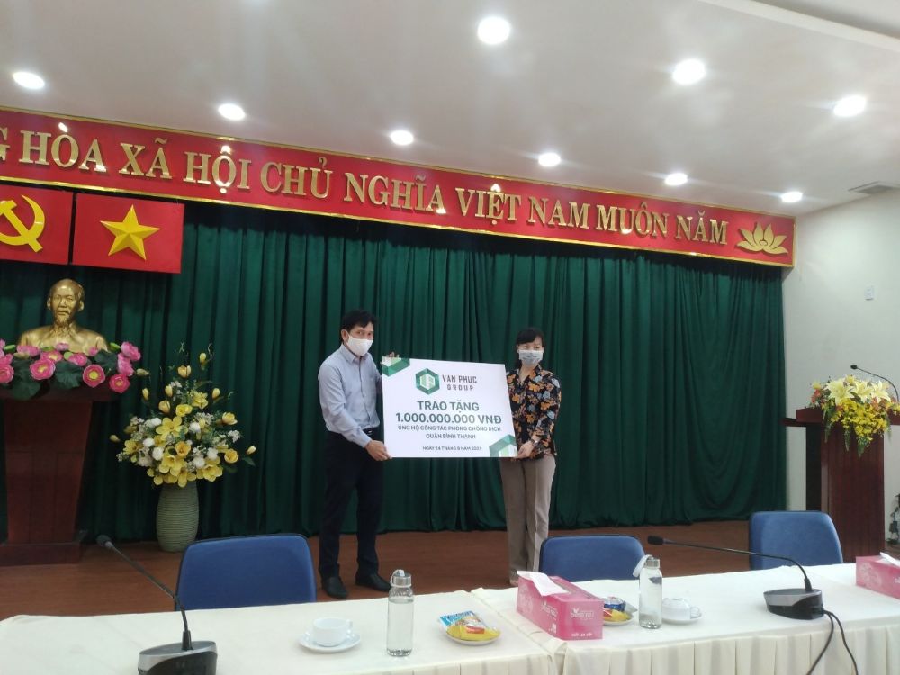 Đại diện Van Phuc Group trao bảng ủng hộ 1 tỷ đồng cho lãnh đạo Quận Bình Thạnh, TP.HCM – Ảnh: VP